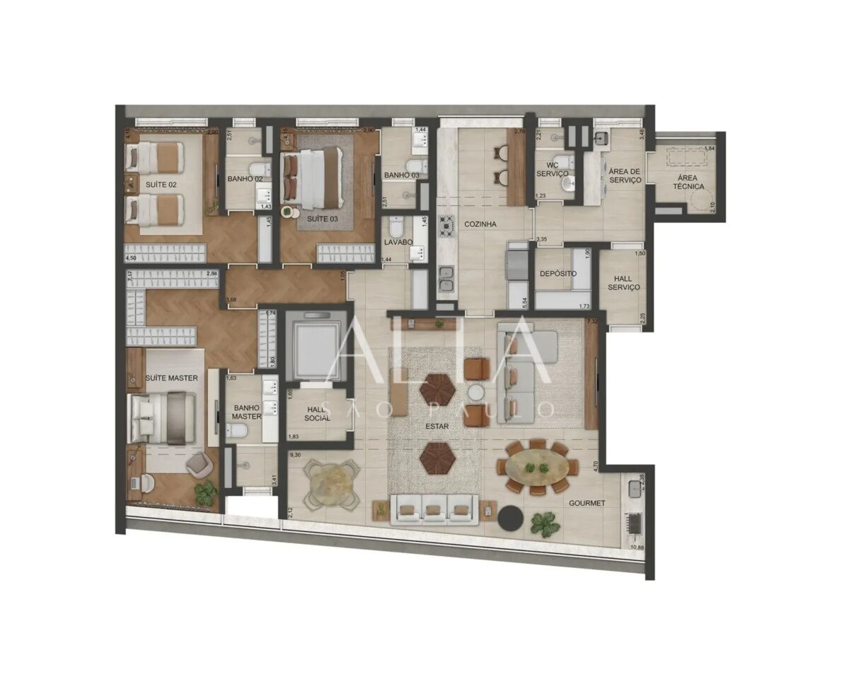 * Planta de 244m² com atenuação acústica (em 02 possíveis layouts: living ampliado ou 04 suítes)