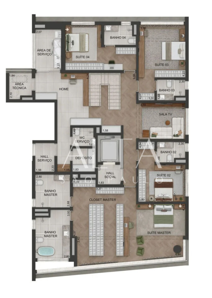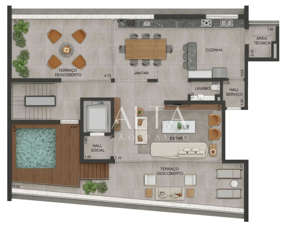 * Terraço descoberto maior com espaço para SOLARIUM AMPLO e PISCINA PRIVATIVA